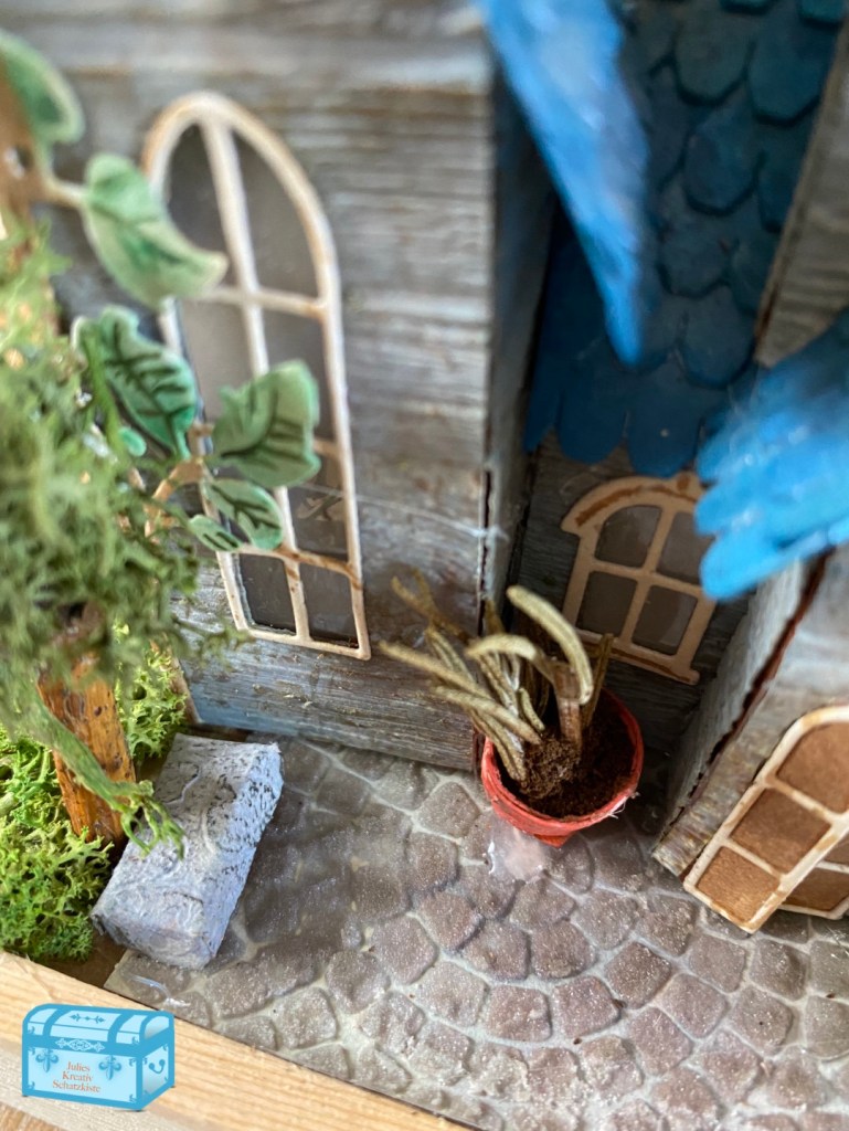 Die Textur der Sitzbank und des Springbrunnens entstand aus dem Sizzix/Tim Holtz 3D Mini-Texture Fades Embossing Folder „Cobblestone“. Die Basis für den Springbrunnen ist ein Teil einer Klopapierrolle. Das Wasser ist ein Karton mit Distress Ink „Mermaid Lagoon“ mit Embossing Glaze Speckled Egg, beides von Ranger.