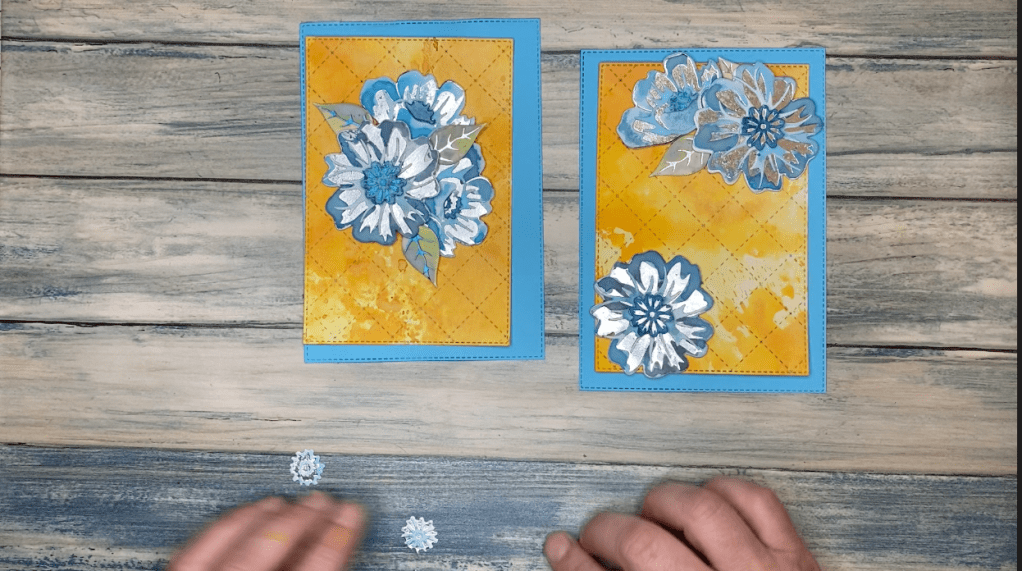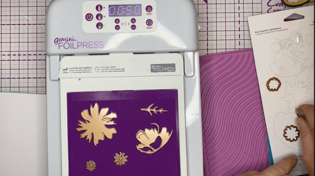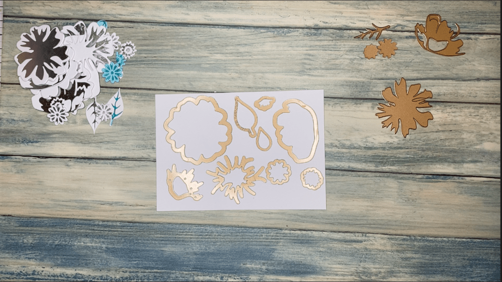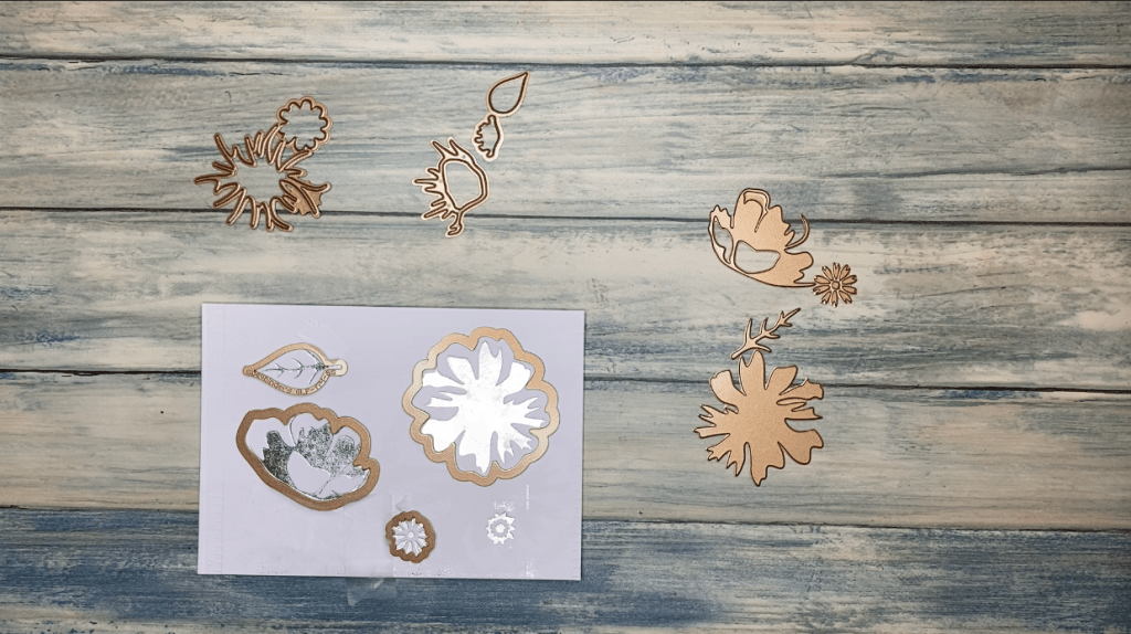 Das Set von Spellbinders enthält sowohl Stanzen als auch Heißfolienplatten (Hot Foil Plates), die kombiniert werden, um verschiende Blumen mit mehreren Ebenen zusammenzusetzen.
