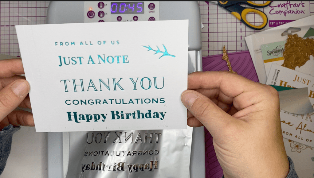 Für die Sentiments meiner Karten habe ich ebenfalls auf ein Spellbinders Produkt zurückgegriffen: Essential Glimmer Sentiments (leider gibt es recht wenige Sentiments auf Deutsch, sodass ich immer wieder englische verwenden muss). Ich habe gleich alle dieser Sentiments mit der Foilpress und Türkise Foil Quill Folie verarbeitet, da ich mich noch nicht festlegen wollte, welches ich für diese Karten verwende.