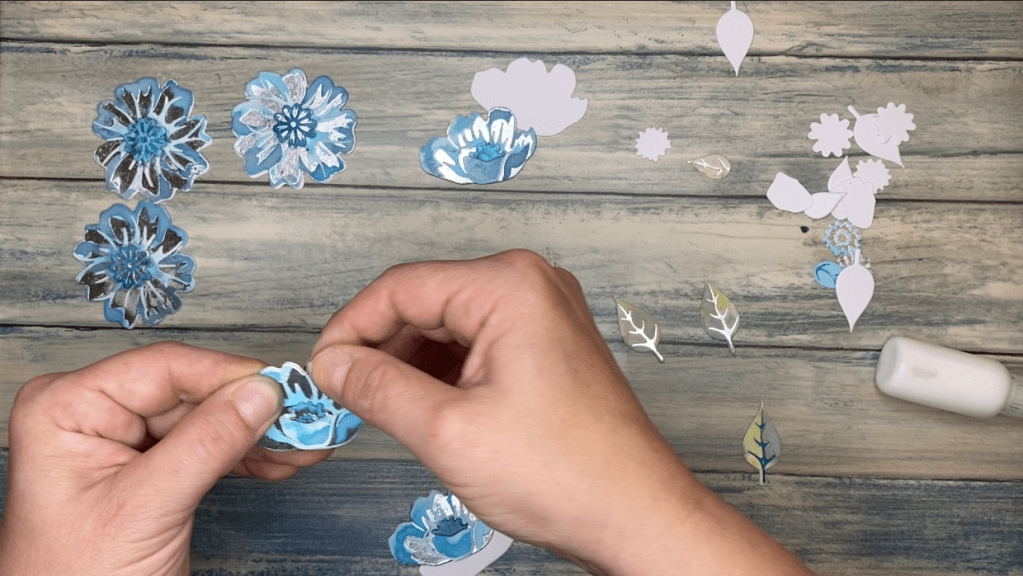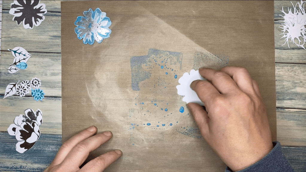 Im nächsten Schritt habe ich einerseits die Papier mit der Folie ausgestanzt sowie andererseits noch alle Teile (die Außenteile der Blumen sowie die Innenteile als obere Schicht) aus Aquarellpapier ausgeschnitten. Die weißen Außenteile (also ohne Folie) werde ich später verwenden, um die Blumen zu verstärken und ihnen auf der Karte mehr Dimension zu verleihen.