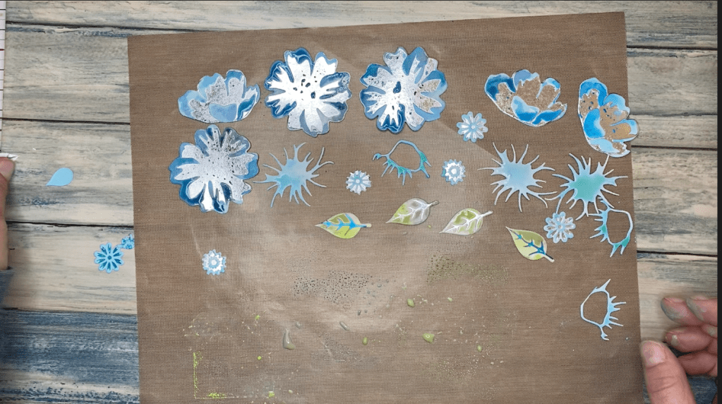 Um die Blumen einzufärben, verwende ich verschiedene Distress Oxides (Farben siehe Auflistung der Materialien unten). Ich bringe ein bißchen Stempelfarbe auf ein Backpapier auf und bespritze diese mit Wasser. Danach nehme ich die einzelnen Stanzteile und ziehe sie durch die Farben. Für die größeren Teile habe ich dünklere Farben verwendet, für die inneren Teile hellere. Am Schluss habe ich noch einen Tropfen metallische Wasserfarbe auf die Innenteile aufgebracht, um sie auch etwas zum glitzern zu bringen. Dann habe ich alles trocknen lassen, um den schönen Aquarelleffekt zu erzielen.