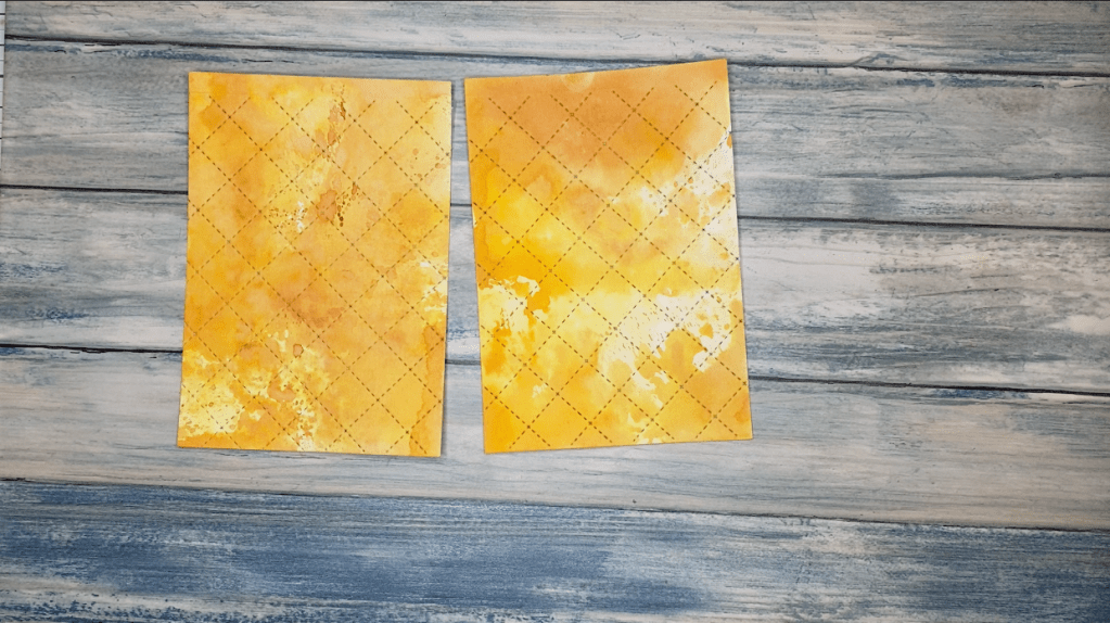 Beim Kartenhintergrund habe ich mit derselben Technik gearbeitet, diesmal in Gelb- und Orangetönen. Zusätzlich habe ich eine Piercing-Stanze (also eine Stanze, die nur Abdrücke macht, aber nicht durchschneidet) von Concord & 9th verwendet und dann die Kartenpanele mit „stiched rectangle dies“ (also Rechtecksstanzen mit Sticklinien) zugeschnitten. Außerdem habe ich eine größere Mattierungsschicht aus einem blauen Papier mit ebenfalls mit den Sticklinien-Stanzen verziert.
