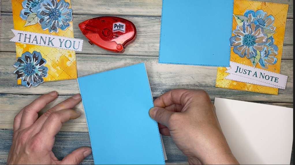 Abschließend werden noch die Sentiments ausgestanzt und die Mattierungen und Kartenpanele auf zwei cremefarbenen Blankokarten mit Tape-Rollern fixiert.