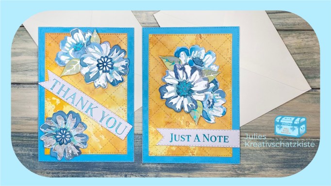 Für die Heißfolienblatte des Blattgewebes und die kleinste Blume (=Blumeninneres der großenblume) gibt es jeweils zwei Stanzformen, die verwendet werden können: ein großes bzw ein kleines Blatt und eine runde Stanzform für eine runde Blumenmitte oder eine kleinere Form, die eine „seitliche“ Blumenmitte ergibt (und dabei einen Teil der Heißfolie wegschneidet.)