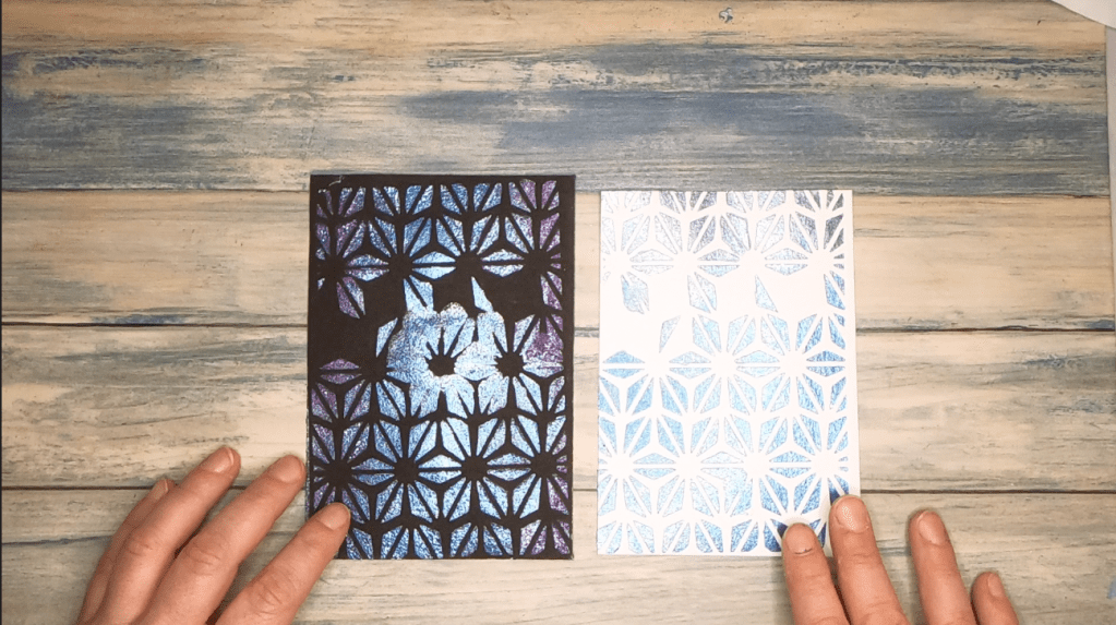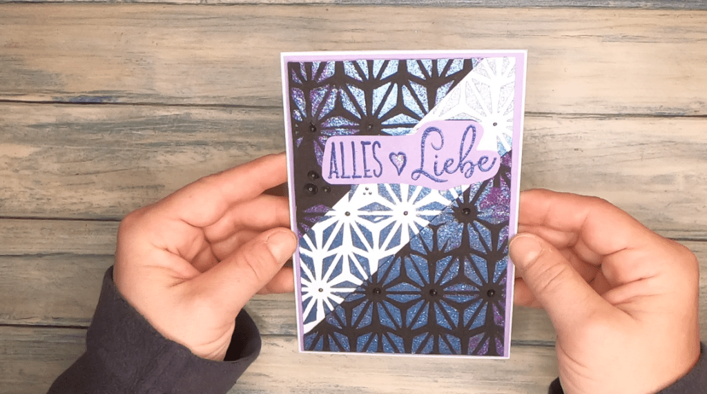 Für die sechste Karte habe ich eine Schablone verwendet, die ich selbst entworfen und ausgeschnitten habe. Für die Glacier Past war sie vielleicht eine Spur zu dünn, denn auf einem der beiden Panele (dem schwarzen -Vielleicht lag es auch am Papier, denn auf dem dickeren Aquarellpapier hat es schon funktioniert.) war das Muster etwas verschmiert in der Mitte. Ich habe diesen Teil einfach weggeschnitten und die beiden verbleibenden Dreiecke auf das weiße Panel mit Foam Tape aufgebracht, damit das Muster kontinuierlich weitergeht.