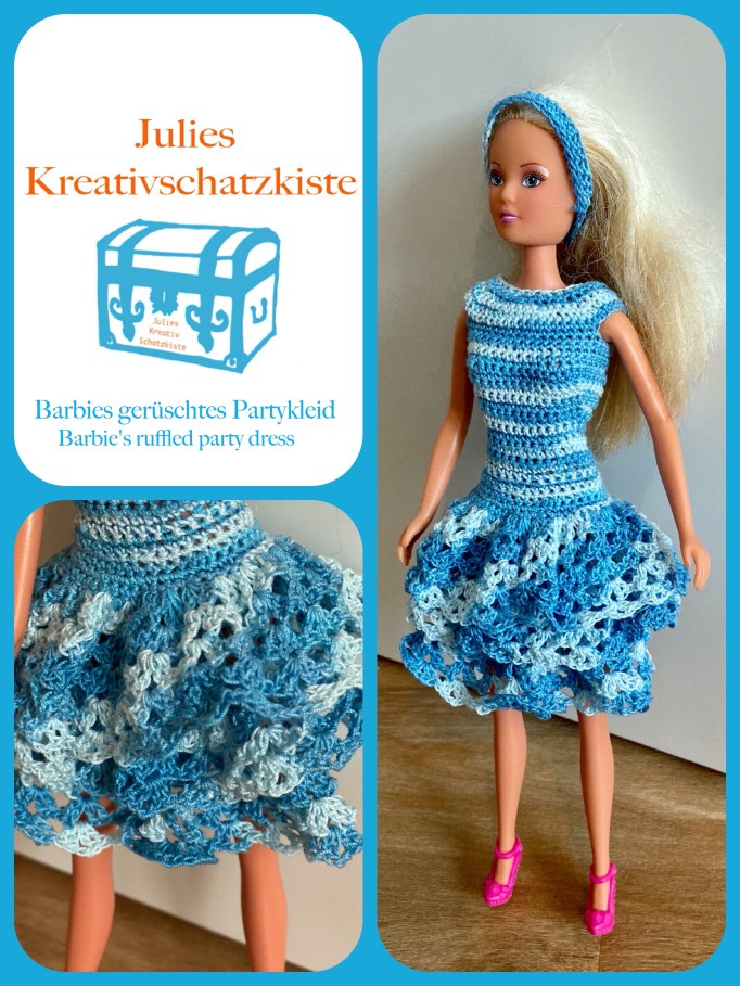 Hier mein neuestes Werk, ein Barbie Kleid mit drei Röcken nach dem Video von MiMi’s Crochet Corner auf YouTube: