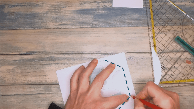 Für die Dachkonstruktion lege ich mir das Haus flach auf ein weiteres Stück Papier und zeichne mir auf beiden Seiten die äußeren Dachschrägen ab. Die Enden verbinde ich oben und unten und dann muss nur mehr eine Klebelasche von ca. 1 cm über die kürzere Verbindungslinie ergänzt werden. Im mittleren Bild unten seht ihr mein Ergebnis. Die Dreiecke rechts und links werden dann nach innen gefaltet, sodass die unteren Kanten genau auf der langen unteren Linie liegen. EIn Dreieck wird nach vorne, das andere nach hinten gefaltet und so wird das in mein Haus geklebt. Die Klebelasche am oberen Ende habe ich mittig eingeschnitten und auch gegengleich umgeboten. Darauf wird das Dach des Hauses fixiert.
